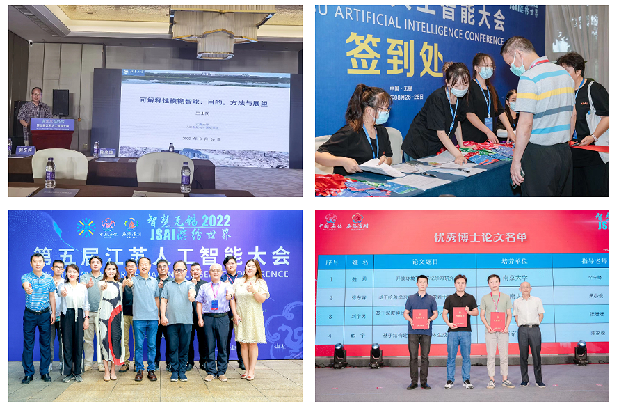 2022年度江苏人工智能学会奖项在会议期间也正式揭晓,评选出技术创新奖(优秀产品)60件、技术应用奖(优秀解决方案)45件、技术推广奖(应用场景示范)10件,评选出优秀博士论文4篇,优秀硕士论文提名4篇。由我校吴小俊教授指导的张东霖和饶东宇分别获得优秀博士论文和优秀硕士论文提名奖。