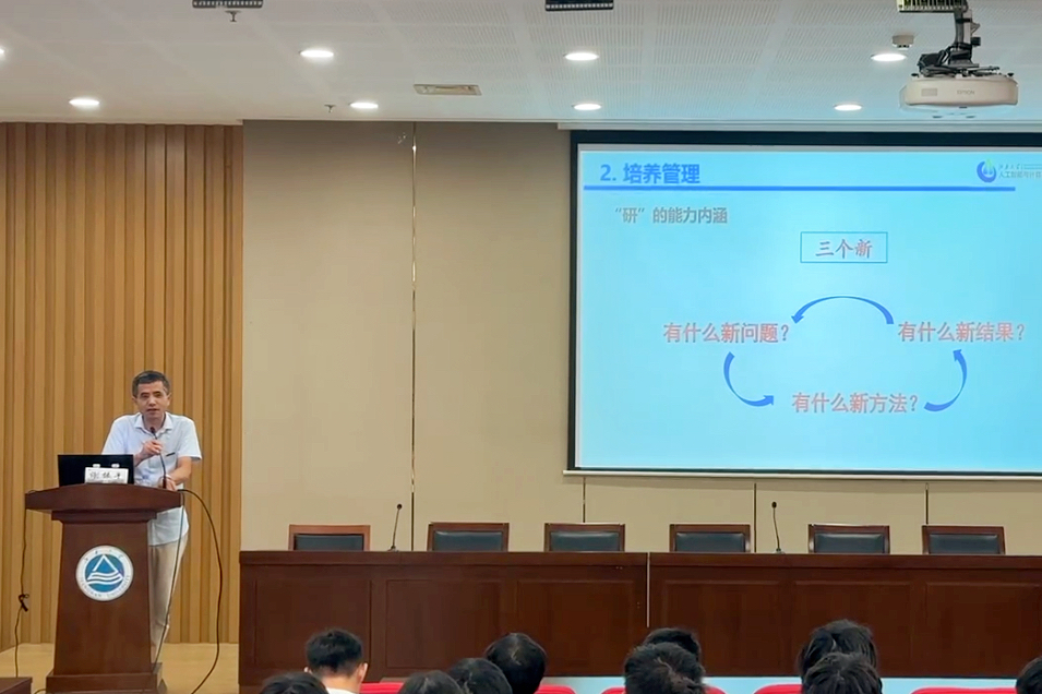 副院长谢振平在图书馆三楼报告厅为全体研究生新生做学术规范教育讲座。他从创新能力角度提出并解答了“有什么新问题、新方法、新结果”的研究生阶段需经历的渐进式难题,并对学硕、专硕及博士的毕业条件和要求进行了解读。希望同学们能够掌握目标导向的学习方式,实现课题研究与就业的平衡,在智能时代书写属于我们的江南故事。