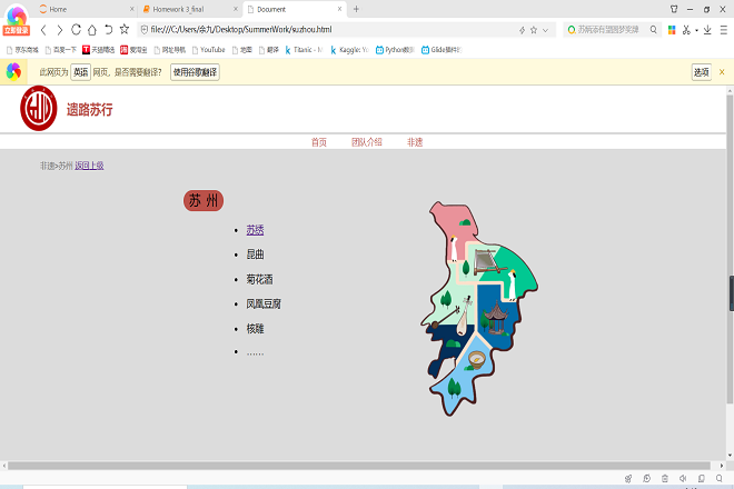 的莘莘学子,实践团成员们将利用自身的专业优势进行二次创作,为非物质文化遗产宣传贡献一份力量。首先,制作江苏非物质文化遗产可视化地图网站,打造集信息化搜索和可视化呈现为一体的地方性非遗展示网站,大家可以更加生动具体地了解到江苏五市各个地方的非物质文化遗产。不仅如此,网站的所有动画图片信息都将由实践团成员依据实践体验进行美术二次创作,绘制各个城市的非遗地图,并将城市拟人化,创造出属于当地城市的可爱的特色“非遗宣讲人”。最后,团员们还会将美术创作的成果衍生成为文化创作,制作精美的文化衫、水杯、徽章和纪念册等文创产品,赠送给实践过程中访问的非遗传承人和热爱非物质文化遗产的人们。