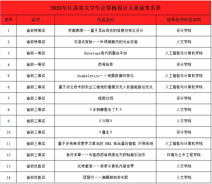 近日,2023年江苏省大学生计算机设计大赛决赛成功举办。经过为期两天激烈的角逐,我校共获得特等奖2项、一等奖2项、 二等奖 3项、 三等奖5项、优胜奖2项,三名指导教师获评优秀指导老师,同人小说
