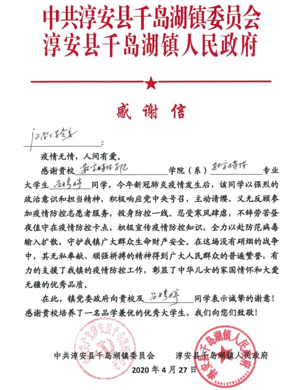 数媒1802班的吕娉婷平时就热心公益,在2月15日到2月17日期间,她参与了浙江杭州千岛湖南苑社区的疫情防控志愿服务。“当时看到社区招募志愿者,我就立马报名参加了,社区给我分配了两个工作日。早上六点,我戴好口罩,站在小区的专门服务点,配合社区的工作人员,对进出小区的人进行登记,查看、核实他们手机上的健康绿码。二月份我们小区进进出出的人并不多,在服务点连续站岗几个小时有点冷也有点累,但是为社区服务真的很开心。”当被问到志愿服务经历时,吕娉婷同学这样说到。当地政府——淳安县千岛湖镇人民政府也向学院发来感谢信,对同人小说