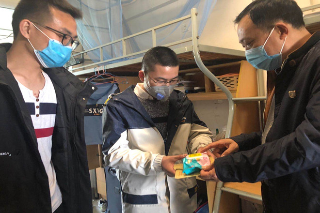 一行人先后来到梅园和瀚苑。在学生宿舍,院领导详细询问了返校学生的健康状况、心理状态、学习情况和毕业进展,对返校同学表达了深切的关心,并代表学院送上口罩、消毒湿巾、消毒洗手液等防疫物资。同时,给每个宿舍发放了返校须知,要求学生张贴在宿舍,认真阅读。交谈中,老师们叮嘱学生要严格遵守学校的管理规定,少流动,不外出,做好自我防护,按时“晨午检”和“晚点名”,有特殊情况及时联系辅导员。