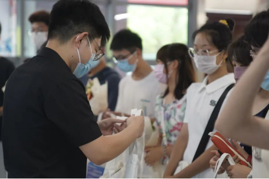 向老师们献花之后,紧接着就是领导与老师们向同学们赠送伴手礼环节,一个个精美的手提袋,装有裹满祝福的月饼,印上同人小说