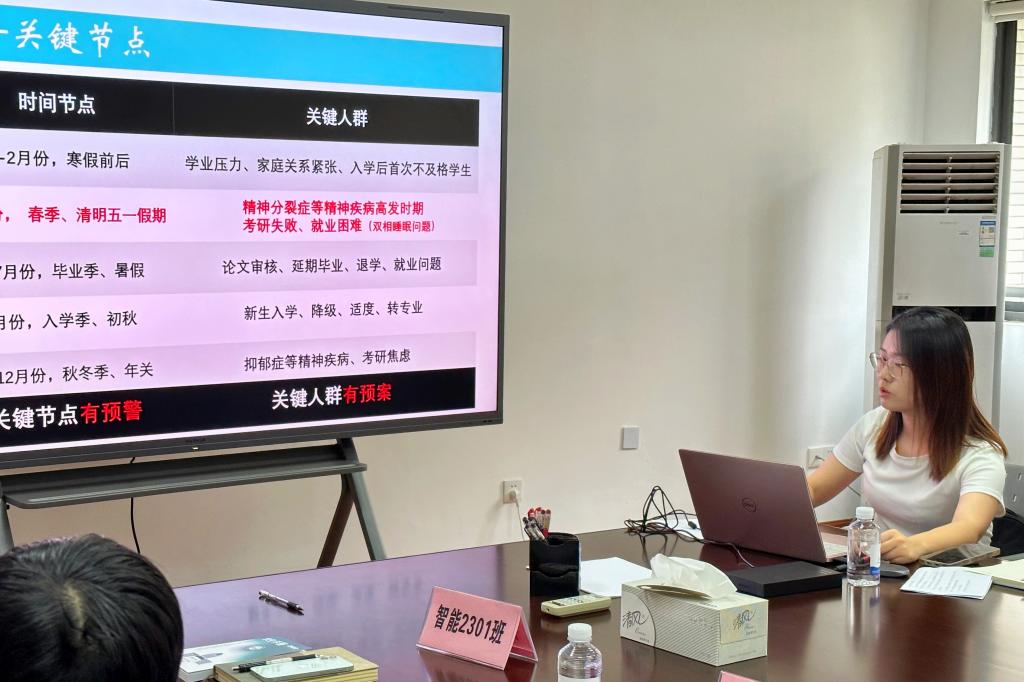 学院心理辅导员杨玉莹以“因势而新,同心而行”为主题,从新时代大学生心理危机的新特点、心理健康教育的重难点、近期新生班主任心理重点工作提示三个方面做心理健康教育专题培训。她表示,班主任一要夯实四级预警机制,构建“上通下达”网络,形成以预防为主的工作格局;二要聚焦重点时段和重点人群,切实做好“8必谈”工作;三要具备会观察、会谈话、会评估、会支持“四会”能力,坚持常进学生门、常知学生事、常解学生忧、常暖学生心“四常”作风。