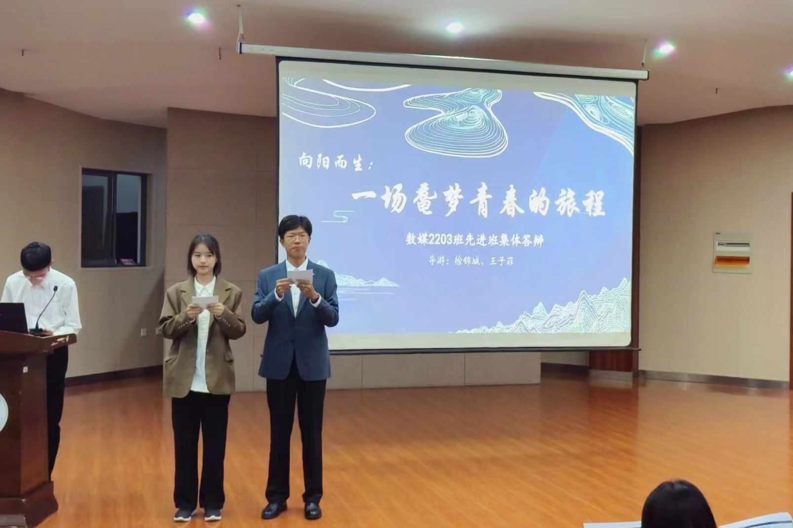 2022-2023学年先进班集体评选会在北区活动中心音乐厅。学院党委副书记、副院长王莉莉,数字媒体技术系主任陈丽芳,人工智能系主任于宏斌,教师代表王宁,分团委书记兼学工办主任王园园,评选班级班主任、辅导员,答辩班级代表及2023级全体班委参加此次活动。