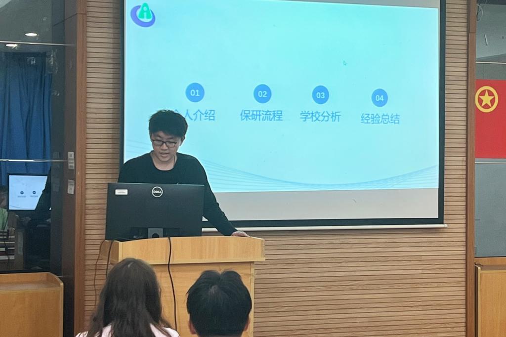 于学院楼B109报告厅举办保研经验分享会,2020级保研学生代表马佳芮、杨家震、李慧敏、杨钧硕担任主讲人。本科生辅导员米宁主持活动。