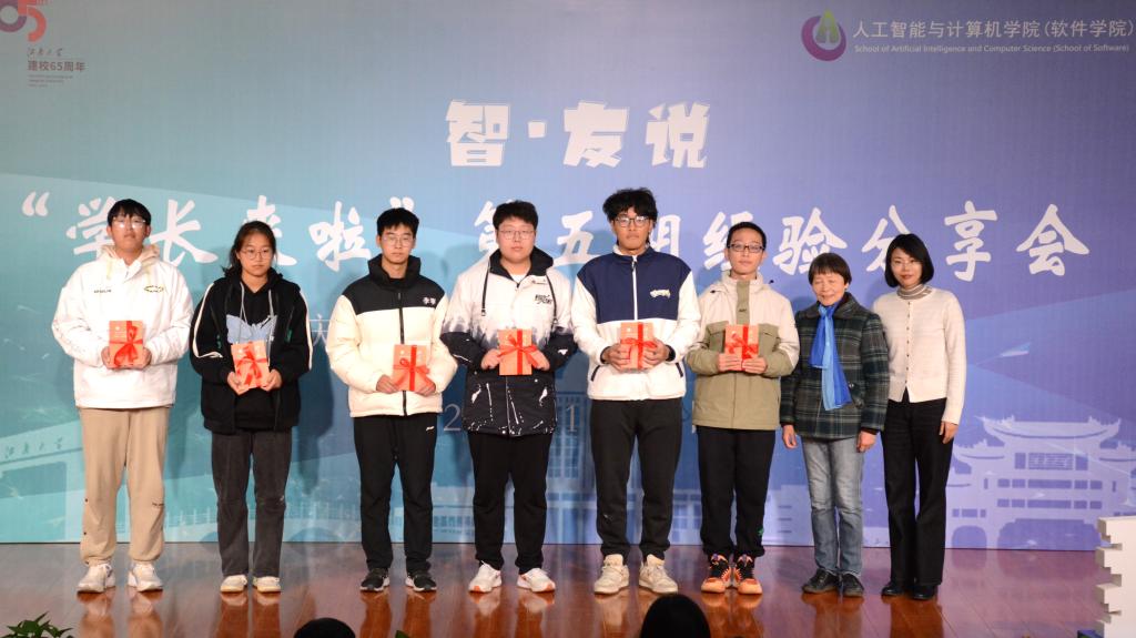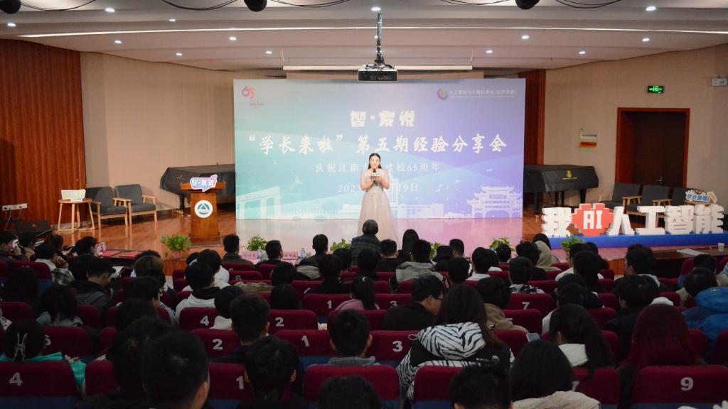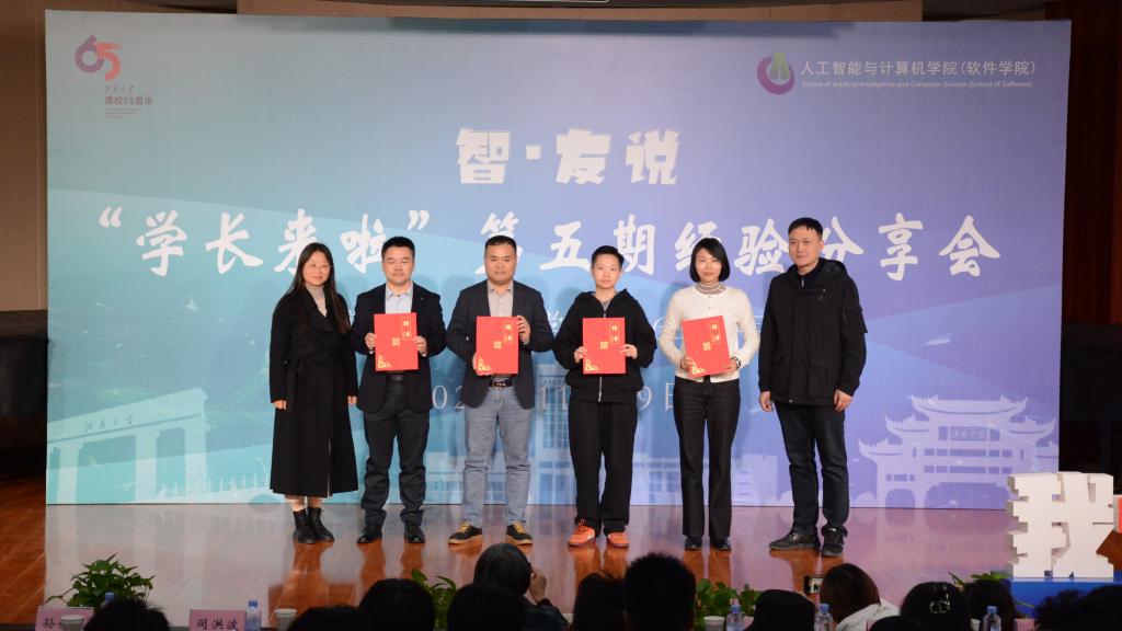 主题分享环节,闵洪波校友围绕“如何开启AI世界大门”做主题分享,鼓励同学们热爱专业、勇于实践,不断超越自我。杨松校友从“大学生活的充实与规划”的角度分享了自己大学生活获得的宝贵成长经历,勉励同学们提早规划,迎接更多不确定性。姜卉校友从“创业十年的风雨历程”中娓娓道来,讲述了从贵州大山一步步走到现在的励志故事。孙创昱校友从高质量就业的角度,鼓励同学利用好在校时光,多参加科创竞赛、多提升实践经历。