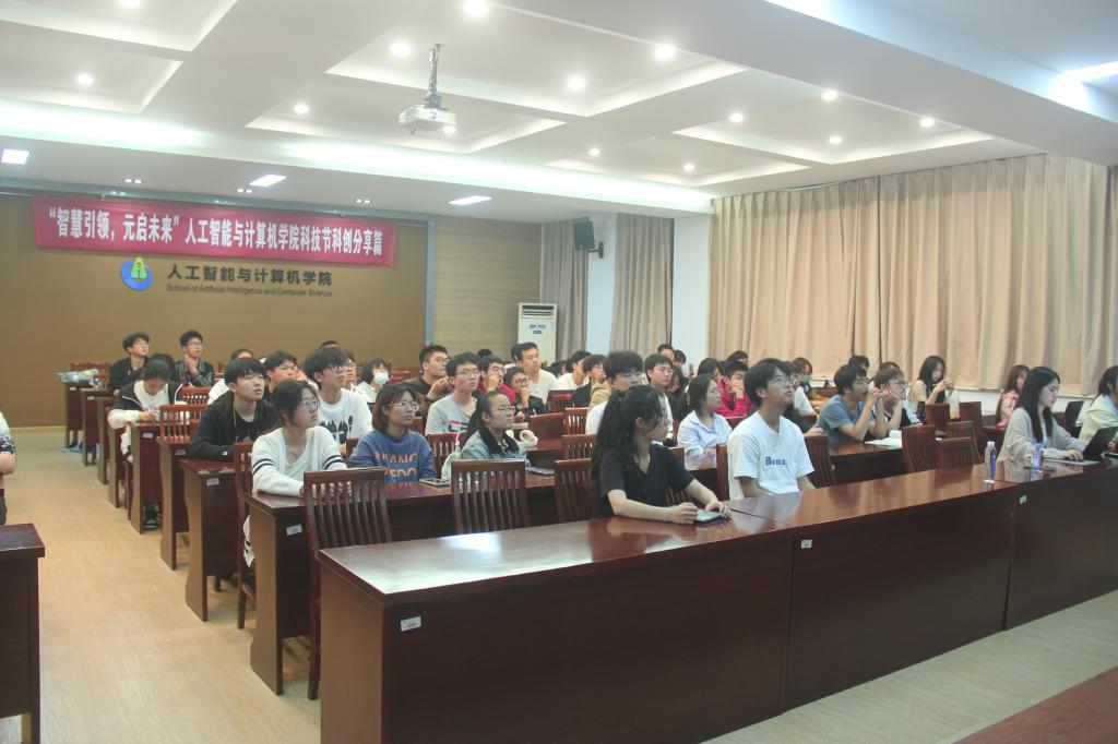 于近日在人工智能楼B310举办“智慧引领,元启未来——本科生科创经验分享会”。本次活动邀请学院马佳芮、张俊杰、范竞元、谭懿唯四位同学作为主讲人。学院负责学科竞赛辅导员李猛和近百位学生参加活动。