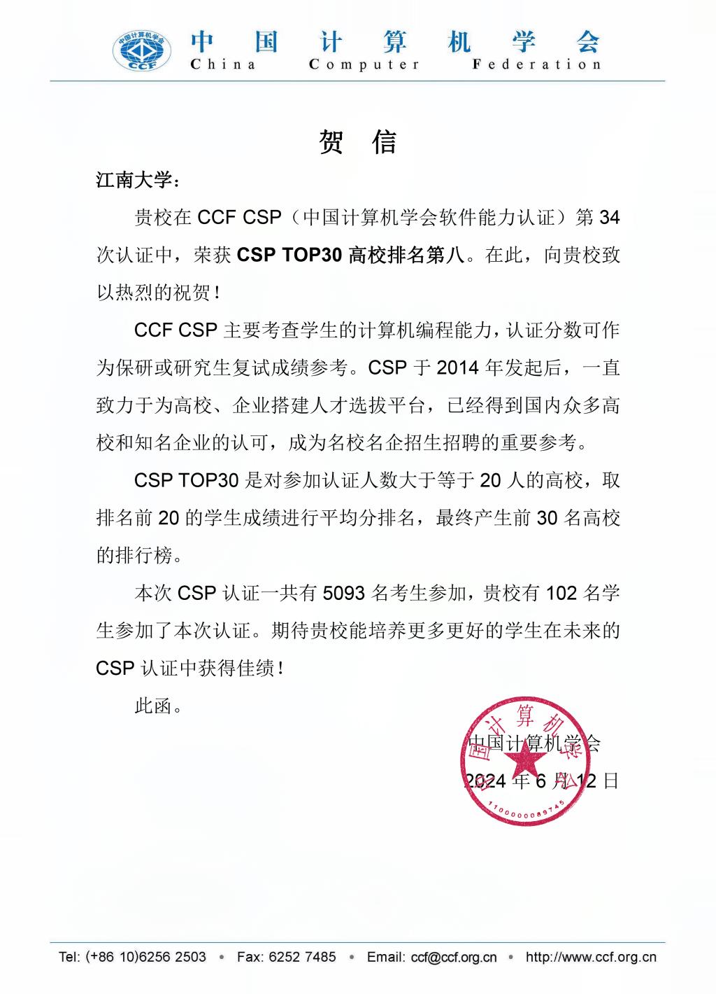 在本次认证中位列CSP TOP30高校(按前20名平均分由高到低排名)第八。