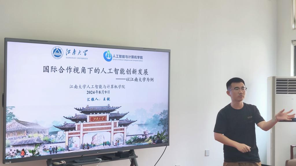 王锐对实践团师生的到来表示欢迎,并作题为《国际合作视角下的人工智能创新发展》的讲座。他以同人小说