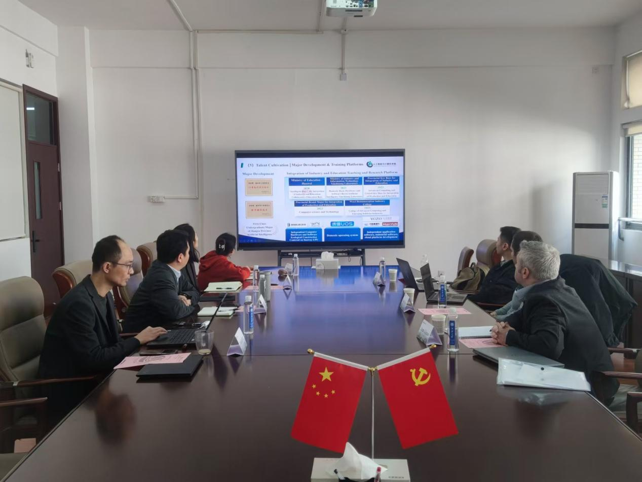 首先,钱鹏江对都柏林大学学院代表团的来访表示热烈欢迎。接着冯振华对人工智能学院的学科概况、科学研究以及人才交流等方面进行了简要介绍。随后,Aidan Murphy向学院介绍了其学院的最新发展情况,并重点介绍了其出色的课程设置。最后,他还表示,计算机学院希望探索各个培养阶段的学生交流机会,并表达了在教师交流和国际研究等其他领域的合作兴趣。