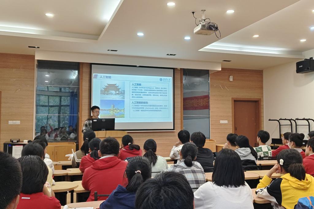 周恒结合AI前沿热点作“视觉大模型原理及应用”主题报告,从模式识别的基本概念、发展历程、常见大模型和未来发展趋势等方面为同学们深入浅出地讲解了什么是视觉大模型,并就“视觉大模型的核心要素”等话题展开探究。张瑞以“走进人工智能”为主题,以图灵测试为引,介绍了人工智能的概念内涵,并通过可视化的方式形象生动地展示了现代人工智能的许多典型成果。