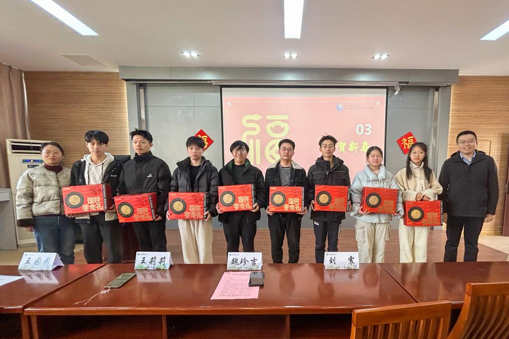 活动最后,魏珍吉和王莉莉为留校同学们派发新春礼包,共同合影留念,定格幸福时光。