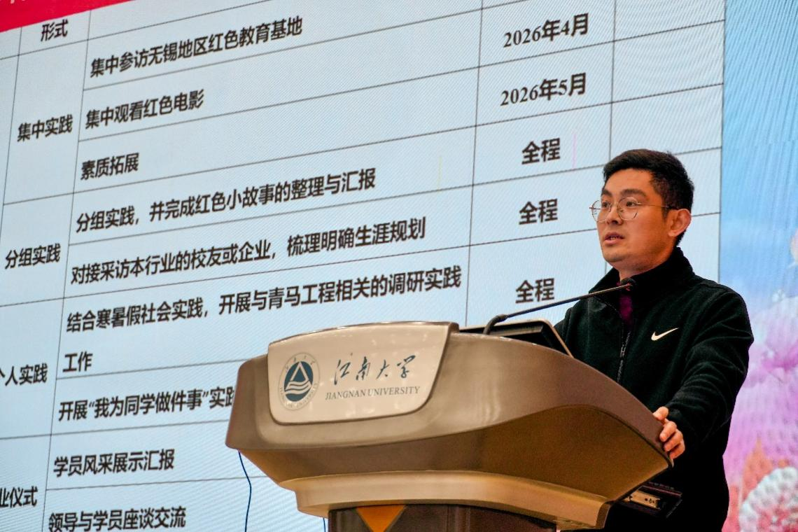 杜磊就本次培训班的培养计划作了具体说明。他介绍,本次“青马工程”培训体系经过精心设计,涵盖“理论学习、工作实务、实践锻炼、总结研讨”四大模块,形成一个贯穿全程、层层递进、相互衔接的完整闭环。在课程设置上,既有夯实思想根基的专题报告与经典研读,也有聚焦个人发展的生涯规划与业务技能培训;既注重通过红色教育和社会调研深化精神素养,更强调通过总结展示来凝练与升华学习成果,全方位助力青年学子成长成才。